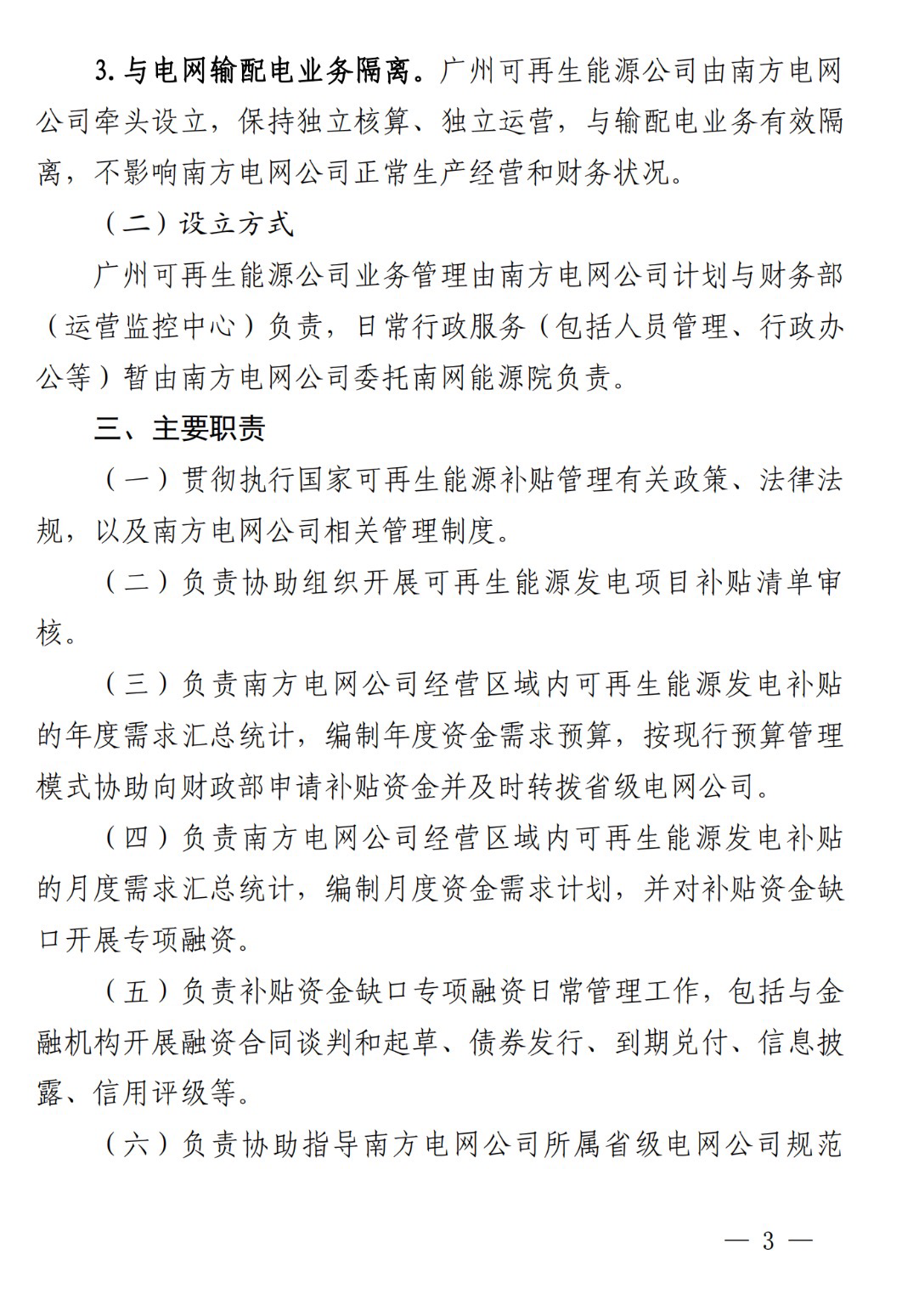 文件明确,广州可再生能源公司主要职责包括负责南方电网公司经营区域内可再生能源发电补贴的月度需求汇总统计,编制月度资金需求计划,并对补贴资金缺口开展专项融资。负责补贴资金缺口专项融资日常管理工作,包括与金融机构开展融资合同谈判和起草、债券发行、到期兑付、信息披露、信用评级等。以及开展可再生能源发电项目补贴清单审核、年度需求汇总统计、编制年度资金需求预算,协助向财政部申请补贴资金、落实补贴的监督核查等。