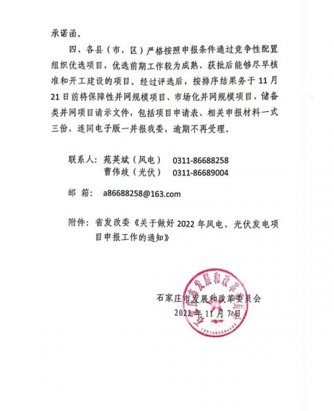 11月7日,河北省石家庄市发改委印发《关于做好2022年风电、光伏发电项目申报工作的通知》,要求项目需按期开工、并网,并由县级政府和开发企业出具承诺函;县级政府不得强制增加其它附加条件,并出具承诺函。