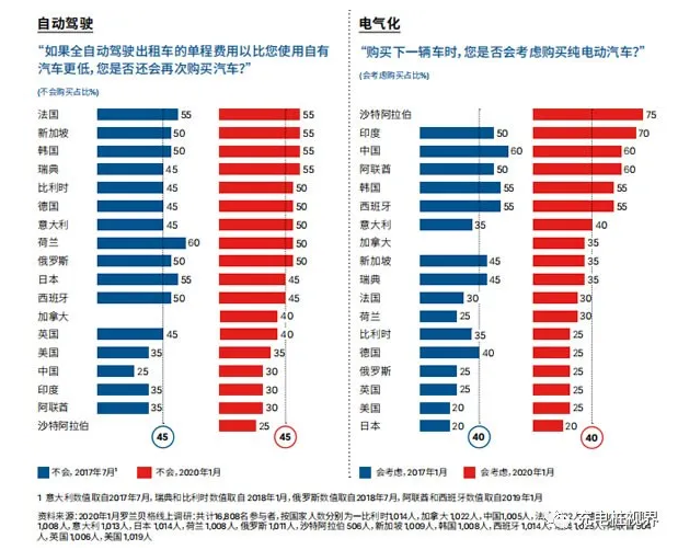第六期《汽车行业颠覆性数据探测》报告发现,尽管汽车行业整体低迷,但消费者对电动汽车和自动驾驶汽车的兴趣仍在增加。第七期报告发现,该兴趣在全球范围内持续维持在较高水平,其中55%的受访者接受使用自动驾驶出租车服务,而40%的消费者考虑购买电动车作为下一辆车。