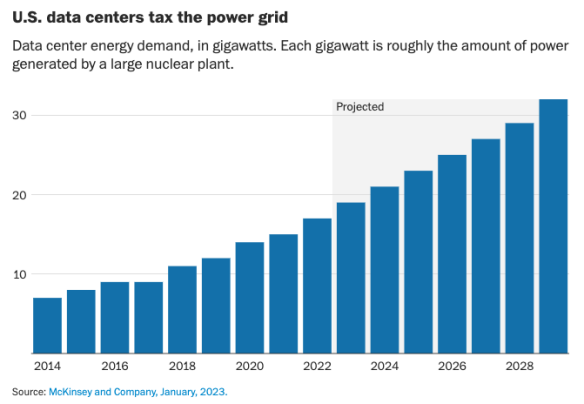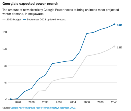 在佐治亚州,对工业电力的需求正在飙升至历史新高,预计未来十年的新增用电量将是现在的17倍。亚利桑那州公共服务公司是该州最大的公用事业公司,它预计如果不进行重大升级,21世纪末将严重缺电。弗吉尼亚州北部所有计划和在建的新数据中心需要几个大型核电站才能保障供电。德克萨斯州在炎热的夏季电力短缺已经成为常态,也面临着同样的困境。