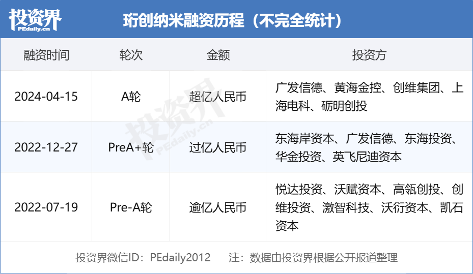 我们先看一起融资事件:今年4月,专业从事新能源电池核心材料企业珩创纳米完成A轮超亿元融资,由广发信德领投,黄海金控、创维投资、电科基金、正景资本跟投。