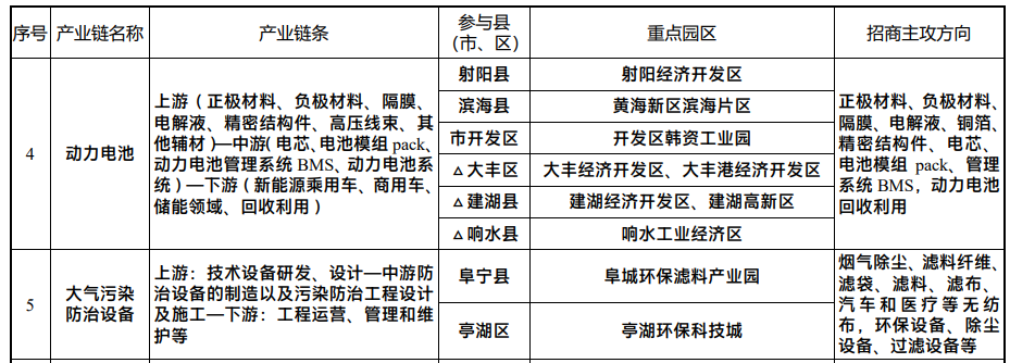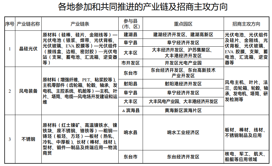 2022年,《盐城市重点产业链培育行动计划(2022-2025年)》提出,聚力打造晶硅光伏、动力电池等5条规模较大、龙头突出的地标性产业链。开展精准招商,编制招商地图,制定各产业链可招引的链主企业、头部企业清单和配套企业清单,挂图作战。
