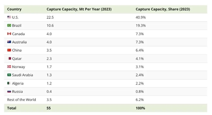 而在这么多项目中,大多数碳捕获、利用和储存(CCUS)能力主要来自美国和巴西,这两个国家总共捕获了3300万吨,占60%的全球总能力。