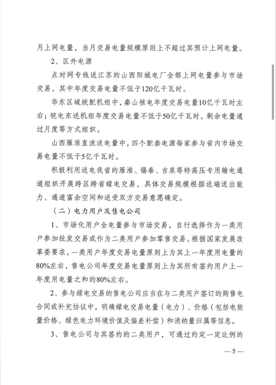 江苏:2025年不参加绿电交易的集中式光伏、风电保量保价为400、800小时