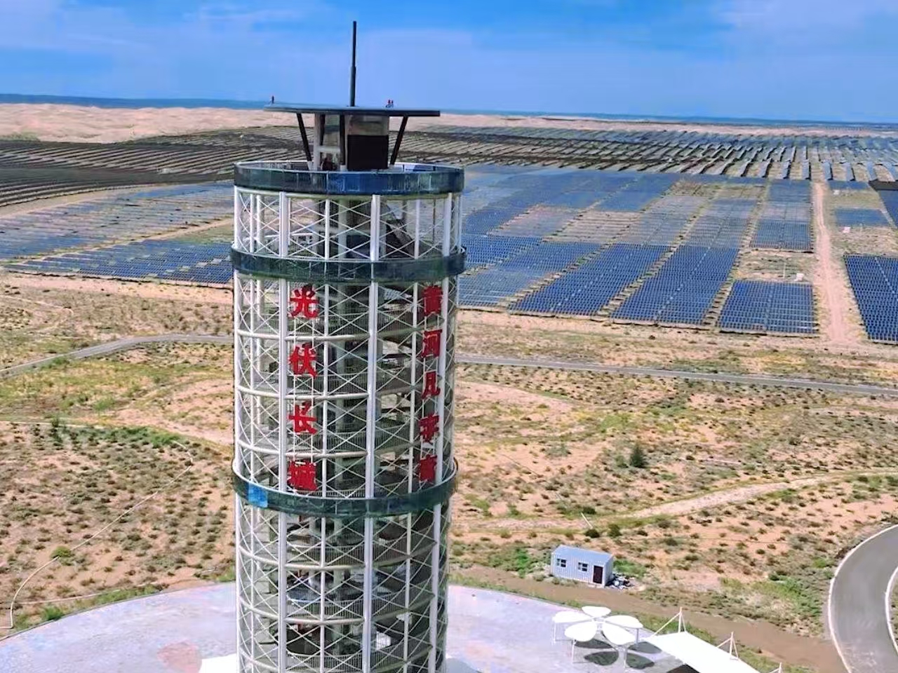 驱车行驶在库布其沙漠穿沙公路,一望无际的蓝色光伏板覆盖在沙漠地表。这里是库布其沙漠鄂尔多斯中北部新能源基地100万千瓦光伏发电先导工程,2023年开工,当年建成并网送电,有效治理沙漠面积近5万亩,成为我国首个新能源反哺化石能源的示范基地。
