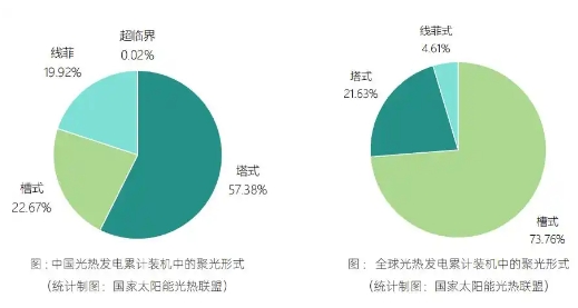 据国家太阳能光热联盟统计,中国光热发电累计装机中,熔融盐塔式(以下简称塔式)约占57.38%%、导热油槽式(以下简称槽式)约占22.67%、熔融盐线性菲涅尔式(以下简称线菲式)约占19.92%%、超临界二氧化碳约占0.02%;全球光热发电累计装机中,塔式、槽式、线菲式分别约占21.63%、73.76%、4.61%。
