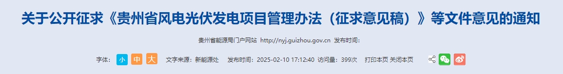 2月10日,贵州省能源局发布关于公开征求《贵州省风电光伏发电项目管理办法(征求意见稿)》等文件意见的通知。