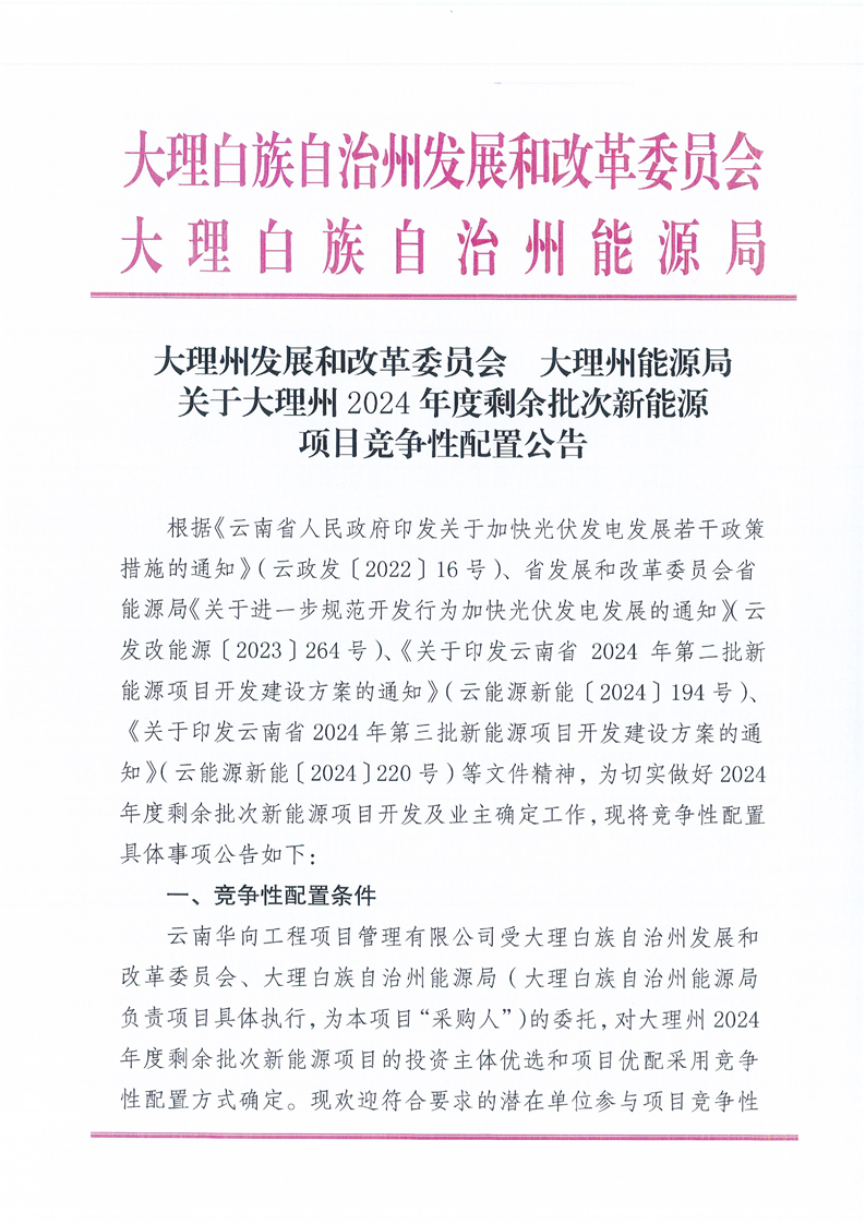 大理州发展和改革委员会 大理州能源局关于大理州2024年度剩余批次新能源项目竞争性配置公告