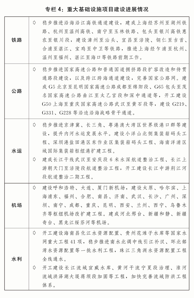 五是加快完善现代化基础设施体系。高质量推进川藏铁路等重大项目建设,加快构建国家水网工程体系,高水平共建西部陆海新通道。深入实施降低全社会物流成本专项行动。持续推进国家物流枢纽、国家骨干冷链物流基地、国家综合货运枢纽体系、大宗商品资源配置枢纽等布局建设。加快完善应急物流体系。深入推进公路水路交通基础设施数字化转型升级。推动各种运输方式规则标准统一协同,加快多式联运“一单制、一箱制”应用。