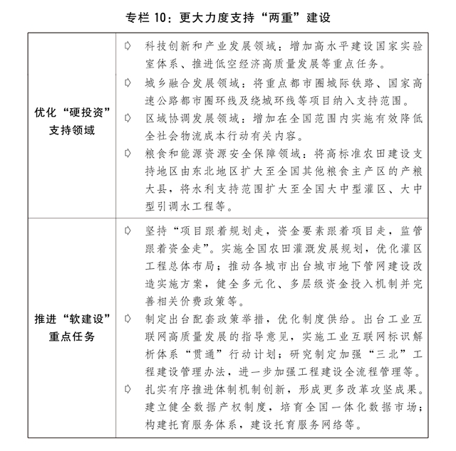 三是加力推进“两重”建设。进一步完善自上而下的工作机制,加强“两重”建设项目储备,更好统筹“硬投资”与“软建设”。安排超长期特别国债8000亿元支持“两重”建设,进一步优化具体投向并提高项目支持比例,重点支持基础研究能力提升、未来产业发展、东北等重点地区高标准农田建设、大中型灌区新建改造及大中型引调水和大中型水库建设、长江经济带生态环境保护和绿色发展、农业转移人口市民化公共服务体系建设、高等教育提质升级、城市地下管网管廊建设改造等方面任务,强化超长期贷款等配套融资,高质量推进“硬投资”项目谋划实施。加大力度推动“软建设”政策落地见效。