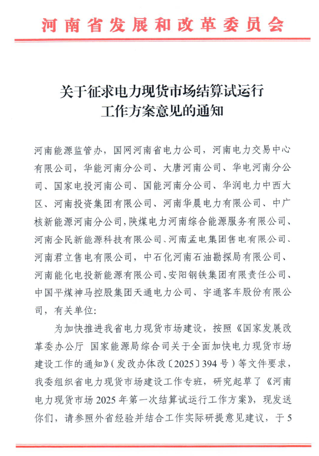 近日,河南省发改委发表了《关于征求电力现货市场结算试运行工作方案意见的通知》,针对《河南电力现货市场2025年第一次结算试运行工作方案》征求意见(以下简称《工作方案》)。河南将于5月份适时开展现货市场结算试运行。