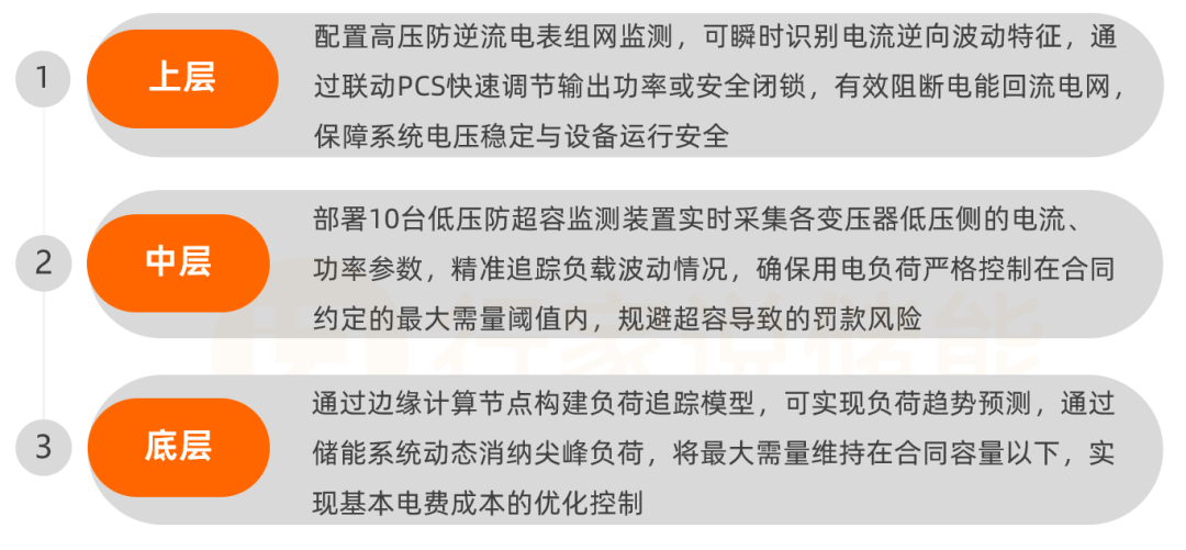 针对厂区变压器分散且容量小、光伏渗透率高带来的容量管控与反送电风险,弘正储能系统构建了三级立体化防护体系: