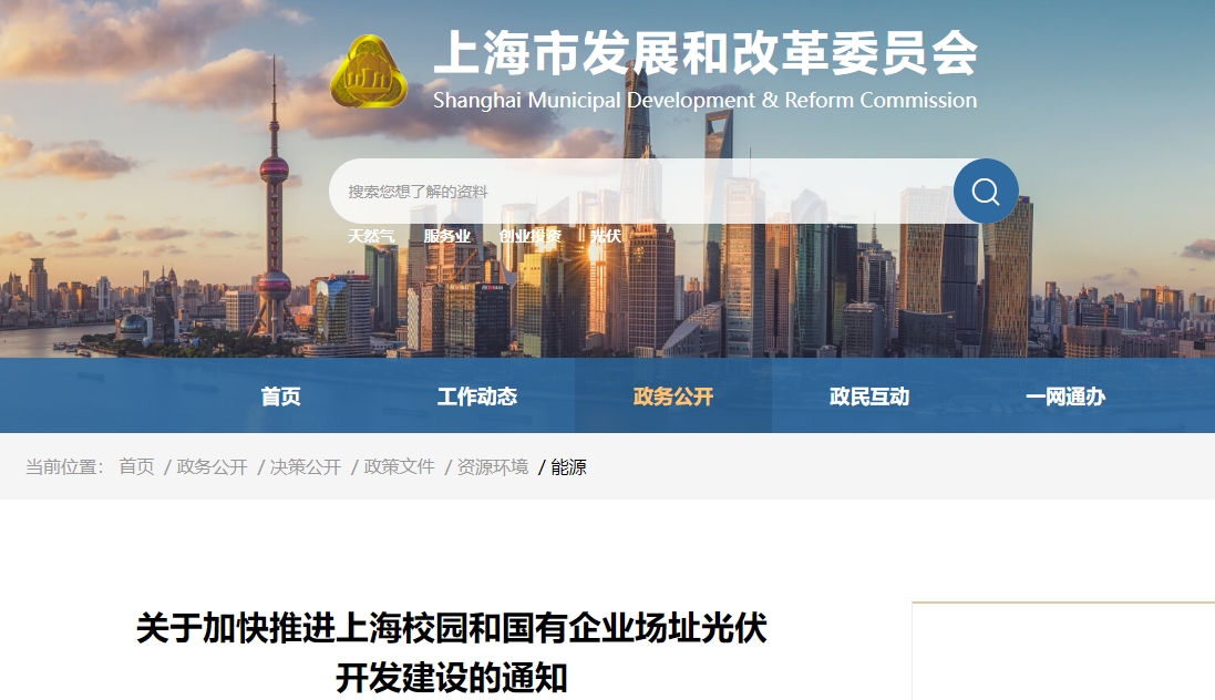 日前,上海发改委、上海市教委、上海市国资委联合印发《关于加快推进上海校园和国有企业场址光伏开发建设的通知》,要求全市范围内具备光伏开发条件的国有企业和学校,结合资源排查情况制定2025-2027年光伏开发专项行动计划。