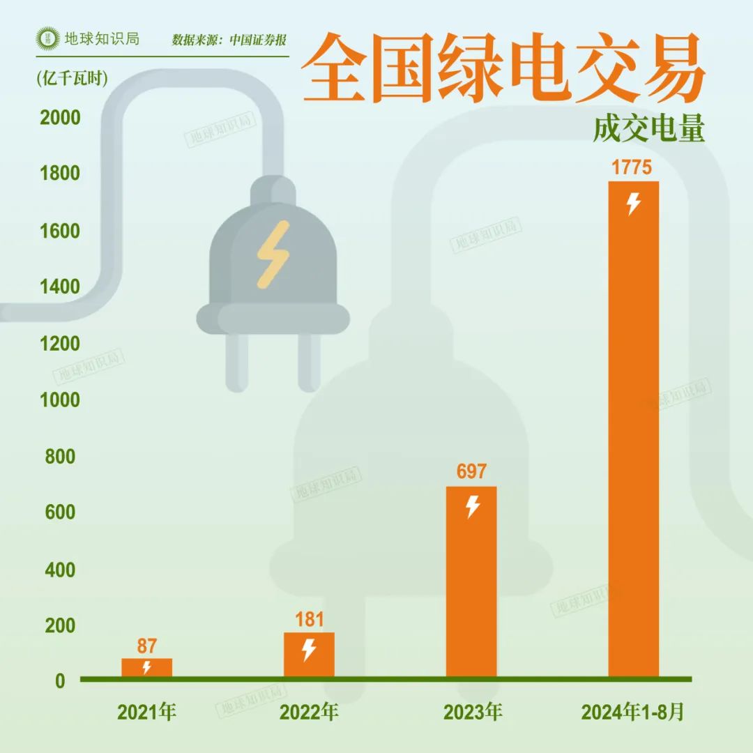 2021年,中国绿电交易正式开市。这几年里,开放北京、广州、内蒙古电力交易中心开展绿电交易试点,成效就已经相当显著。在2021-2023这三年里,全国绿电交易成交电量年均增长283%,2024年1-8月绿电交易更是成交了1775亿千瓦,比2023年全年翻了一倍还多。
