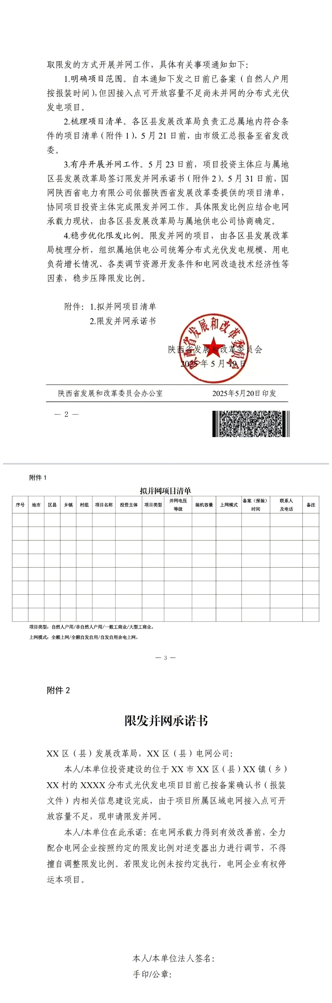 根据陕西省发改委5月20日发布的紧急通知,针对接入容量不足的分布式光伏项目推出限发并网机制: