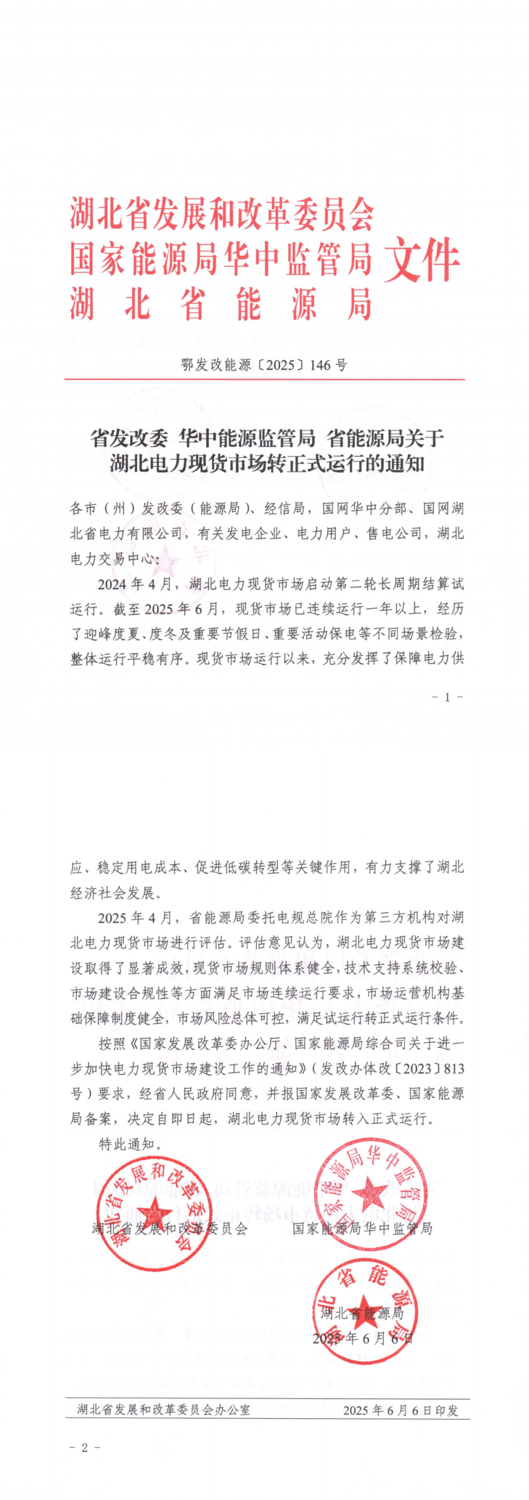 6月6日,湖北省发改委、华中能源监管局、湖北省能源局发布关于湖北电力现货市场转正式运行的通知。经湖北省人民政府同意,并报国家发展改革委、国家能源局备案,决定自即日起,湖北电力现货市场转入正式运行。