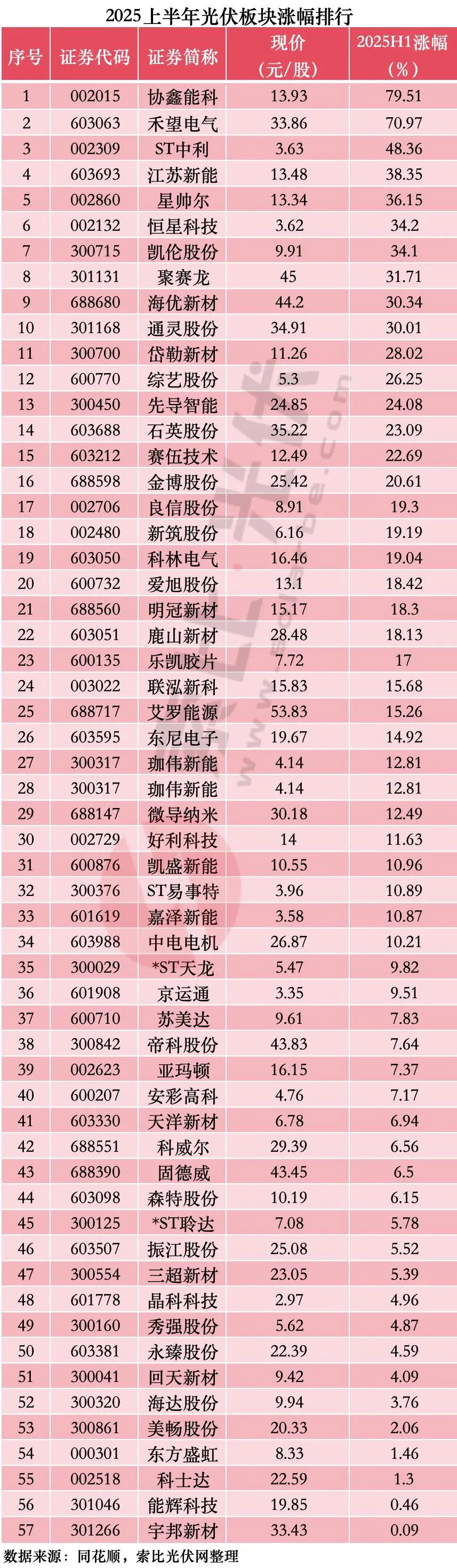 2025年上半年,光伏个股的股价表现可圈可点。根据索比光伏网的统计,截至2025年6月30日收盘,共有58只光伏个股实现逆势上涨,在129只光伏个股中占比达到45%。个股方面,协鑫能科、禾望电气、ST中利累计涨幅分别达到79.51%、70.69%、48.77%位居前三,涨幅超过20%的个股达到16家。