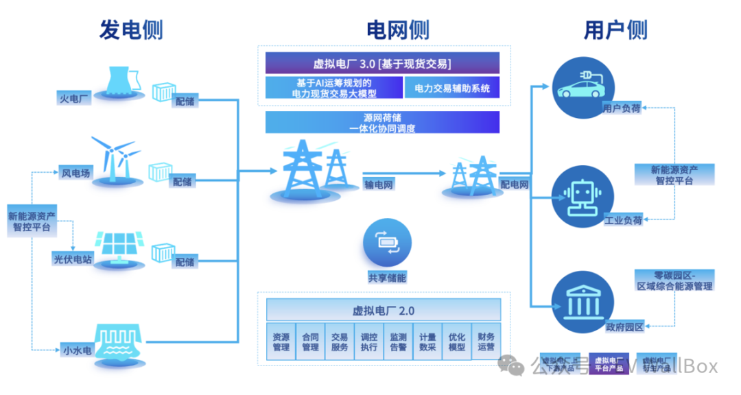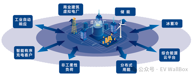 指通过先进的通信技术、人工智能算法和智能能源管理系统(Energy Management System,EMS),将分布式电源(Distributed Generation,DG)、储能系统(Energy Storage System,ESS)、可控负荷(Controllable Load)等各类分散的资源聚合成一个虚拟的可控电厂,通过电网交互实现经济效益和电力调节功能。