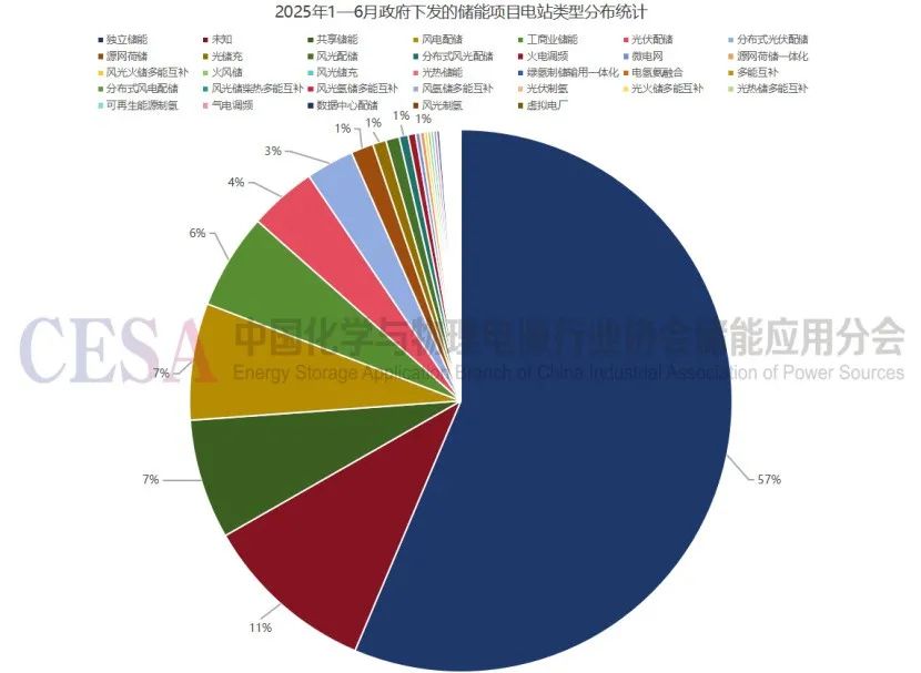 2025年1-6月政府发布的储能项目呈现多元化发展态势,独立储能以632个项目占据主导地位,占比超50%,反映出新型电力系统建设对规模化储能资源的迫切需求。共享储能模式加速推广,80个项目体现电网侧资源优化配置趋势;78项风电配储与45项光伏配储形成新能源配套主力,其中分布式光伏配储32项占比提升,显示分布式能源与储能的融合加深。