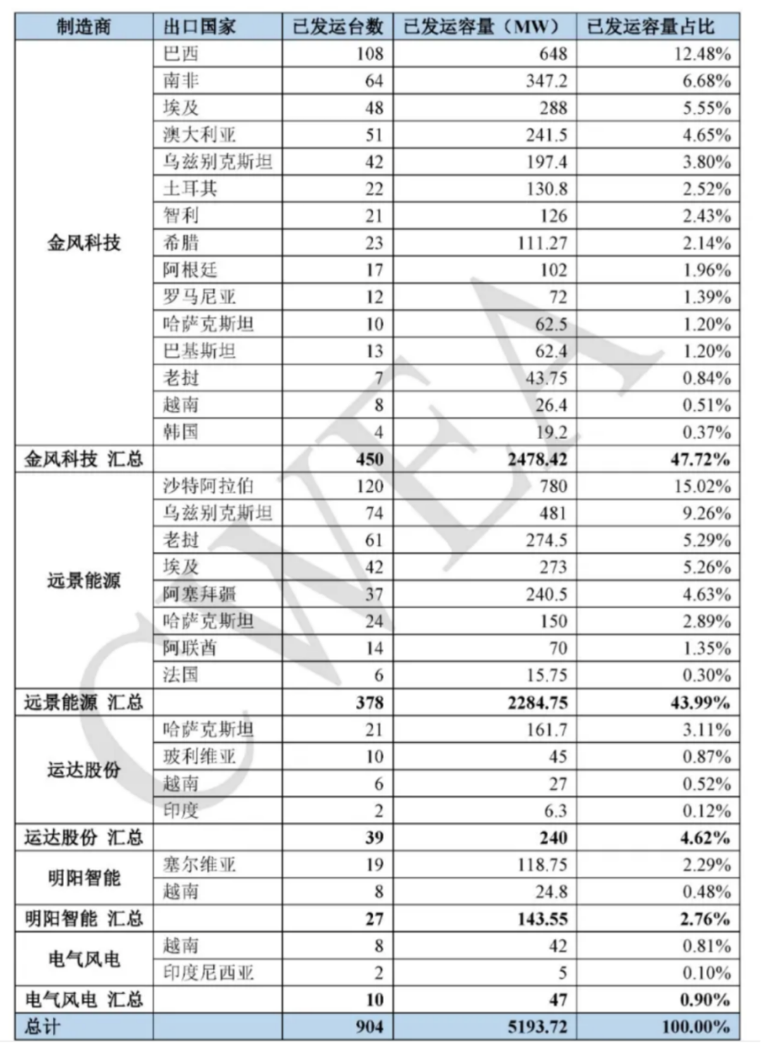 综合风能专委会和巴西的风电装机数据,截至2023年底,巴西风电累计装机30.4GW,其中中国风机累计出口巴西313.5兆瓦,占比仅约1%。而2024年,巴西新增风电装机3.3GW,其中中国出口巴西648兆瓦,占比提高至20%。