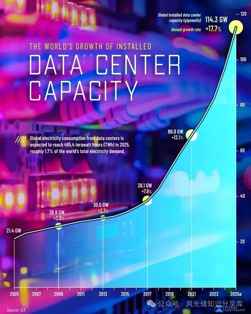 图1:2005–2025年全球数据中心装机容量增长趋势(来源:IEA,Visual Capitalist)