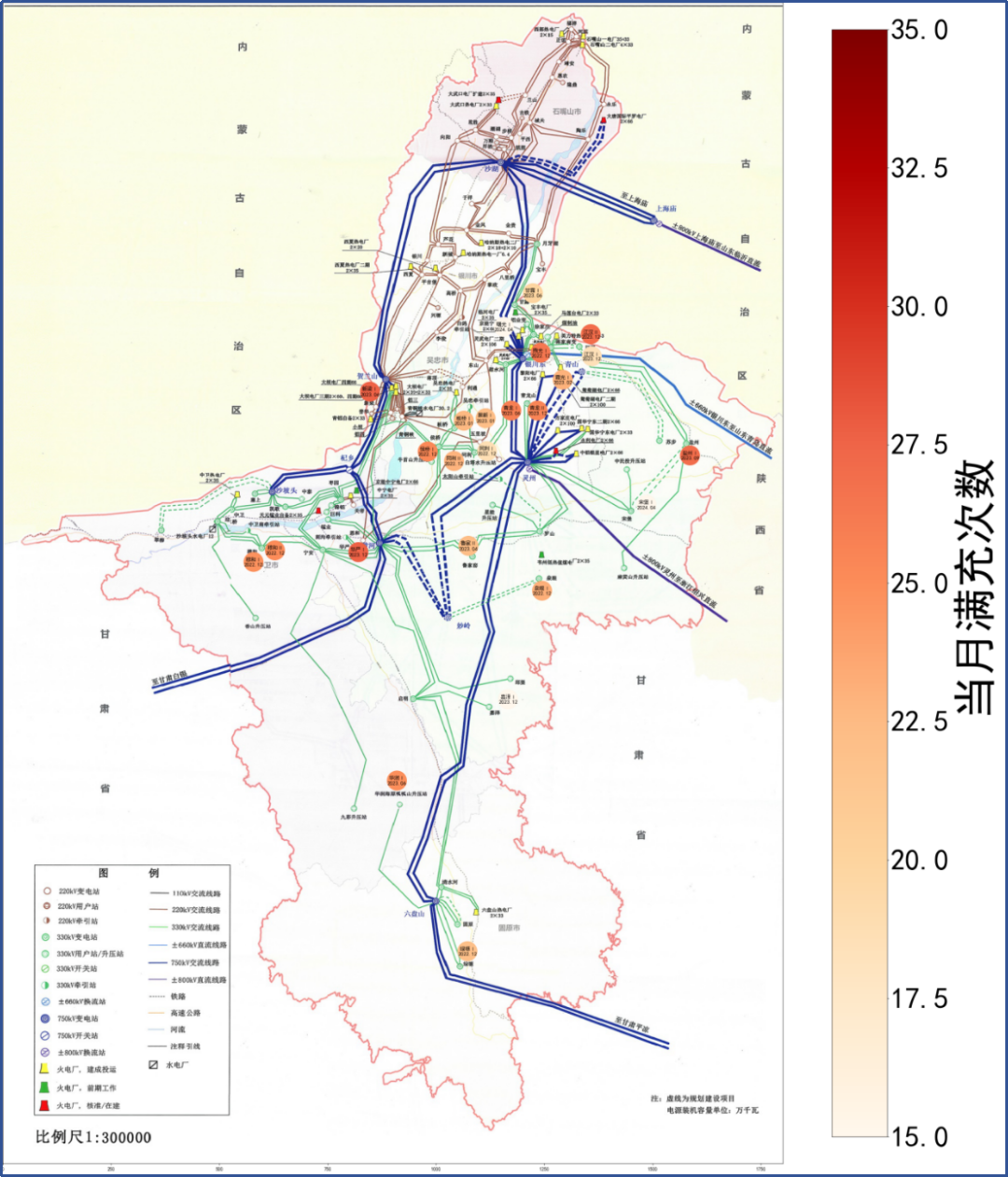 上图是24年4月份宁夏地区储能电站当月储能电站折算满充次数热点分析,就能够看出储能电站的充放电调用次数和新能源装机集中度、负荷布局、潮流、断面和节点有强耦合关系。