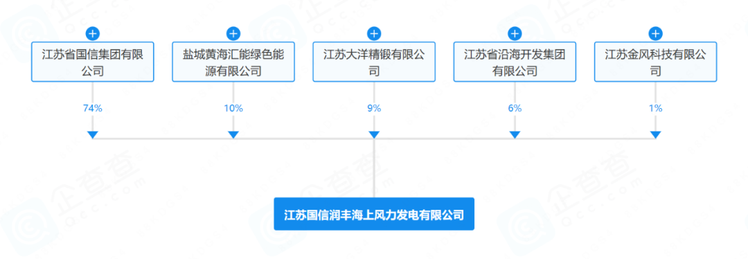 近日,江苏国信润丰海上风力发电有限公司成立,注册资本为10.25亿元。新公司由江苏省国信集团有限公司(74.00%)、盐城黄海汇能绿色能源有限公司(10.00%)、江苏大洋精锻有限公司(9.00%)、江苏省沿海开发集团有限公司(6.00%)、江苏金风科技有限公司(1.00%)共同持股。