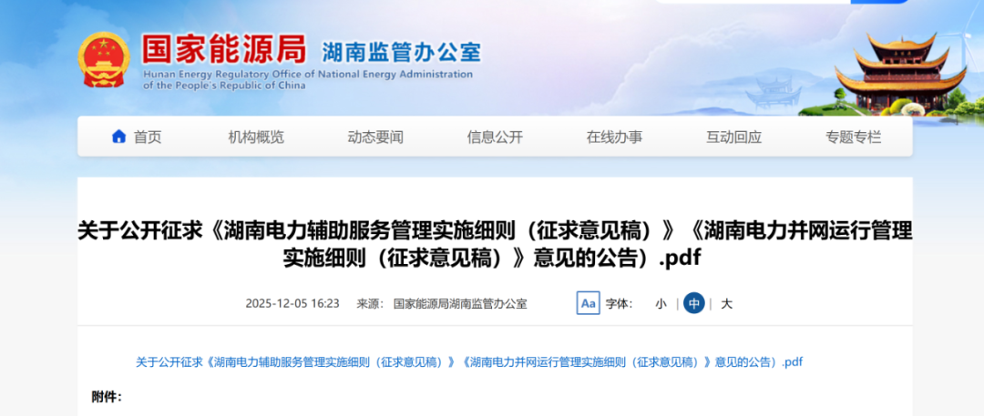 近日,国家能源局湖南监管办发布关于公开征求《湖南电力辅助服务管理实施细则(征求意见稿)》《湖南电力并网运行管理实施细则(征求意见稿)》意见的公告。