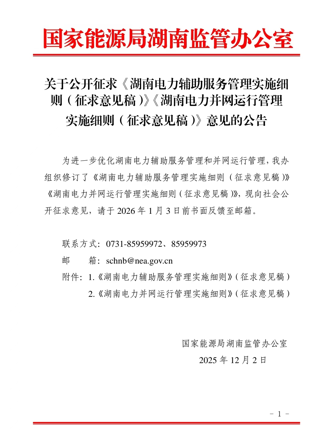 关于公开征求《湖南电力辅助服务管理实施细则(征求意见稿)》《湖南电力并网运行管理实施细则(征求意见稿)》意见的公告)