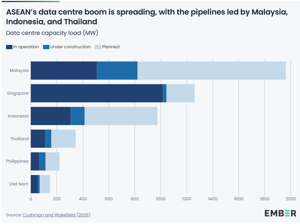 人工智能(AI)和数据中心的发展成为2025年最受关注的能源议题之一。能够满足不断增长的电力需求的企业将站在技术革命的前沿——而太阳能和风能正证明它们有能力胜任这一任务。Ember的东盟分析显示,到2030年,数据中心可能占全国电力需求的2%至30%,不包括越南。例如,在马来西亚,如果这种增长通过以化石燃料为主的电网来满足,排放量可能会增加七倍,而太阳能和风能则可能满足多达30%的需求。在欧洲,瓶颈在于基础设施:法兰克福、伦敦和都柏林等枢纽的电网拥堵造成了7至10年的连接队列,推动新的人工智能投资流向容量更清洁、更可用的地区。信息很明确:人工智能竞赛现在变成了电力和电网竞赛。那些能够扩大可再生能源规模并加快电网升级的国家,将成为下一波数字经济增长的主力。