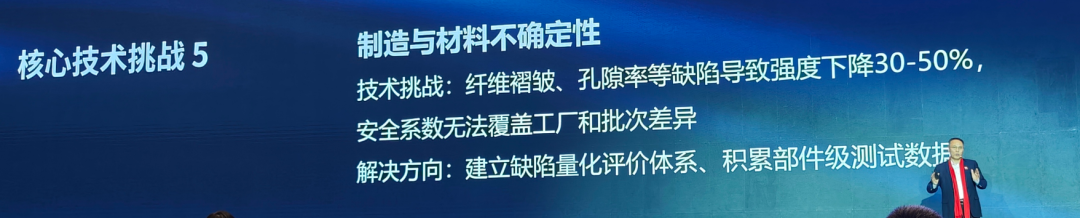 技术挑战:纤维褶皱、孔隙率等缺陷导致强度下降30-50%,安全系数无法覆盖工厂和批次差异。