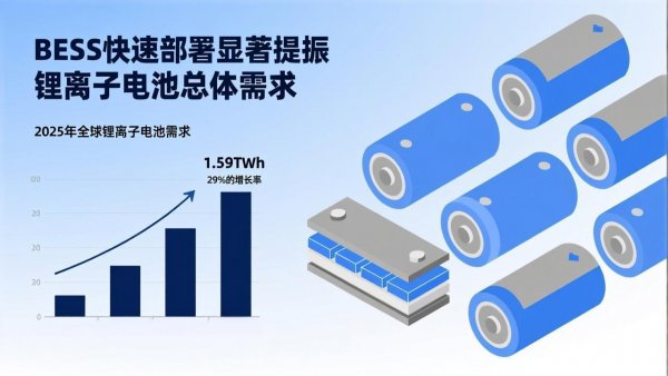 BESS的快速部署显著提振了锂离子电池的总体需求。报告称,2025年全球锂离子电池需求增长了29%,达到1.59TWh。