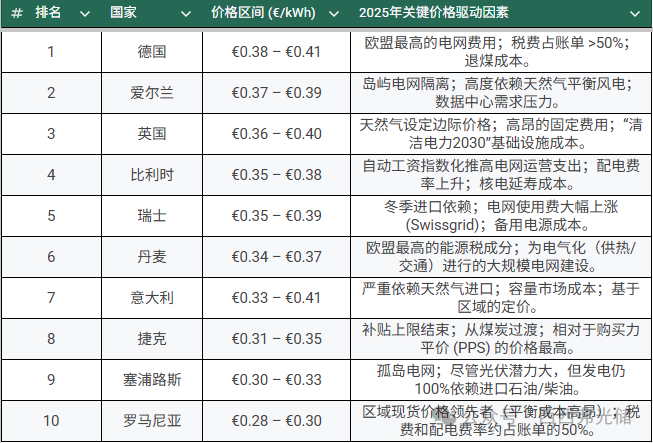 基于Eurostat 2025年H1数据及各国监管机构发布的最新名义电价(含税费)与购买力平价(PPS)数据,以下十国是欧洲居民用电成本最高的市场: