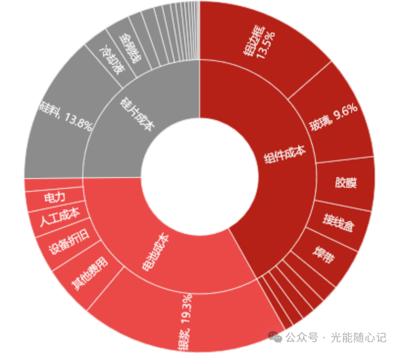 按 1 月 26 日最新银价测算,尽管部分企业已导入降银方案,让银浆在组件成本中的占比从 2025 年的 29% 回落至 19%-24%,但仍远超硅料(14%),稳居组件第一大成本项。