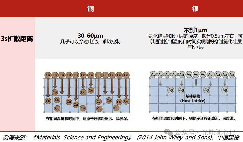 铜的易扩散性:烧结温度下,铜在硅中3秒可以扩散30-60μm(银不到1μm),而电池片厚度约130-150μm,因此铜扩散很难像银扩散一样通过工艺窗口进行控制(例如只烧穿氮化硅层与钝化层与P+层接触,但不能到达PN结),且铜在高温硅(600-800℃)中的溶解度极高,一旦接触到硅(Si)或二氧化硅(SiO2),铜原子会迅速扩散,冷却后又形成铜硅沉淀导致电池漏电或短路。