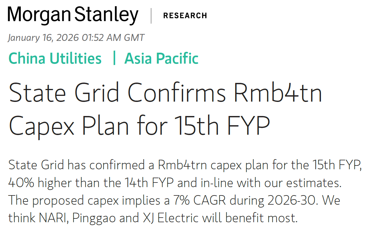 这份摩根士丹利的更新报告,说白了就两句话:国家电网“十五五”要真金白银砸下去,规模比“十四五”大一截;而在这场长期工程里,谁更有机会吃到肉,谁可能被节奏拖累,报告给出了相对清晰的指向。