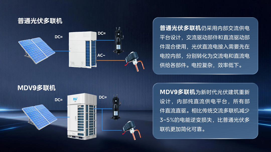 在此背景下,光伏将作为建筑的“第五立面”从可选迈向必选,负荷功耗与光伏发电功率曲线最为契合且楼宇能耗占比最高的暖通空调成为绿电消纳的首要贡献者。传统多联机面临接入光伏需承担较高逆变设备投入和能源转换损耗的挑战。