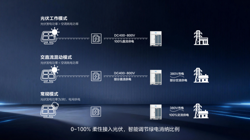 针对此,美的楼宇科技全新研发的多联机新品MDV9,其原生直流架构设计可实现绿电柔性消纳,实现光伏发电0-100%柔性接入,从而打破光伏接入枷锁。