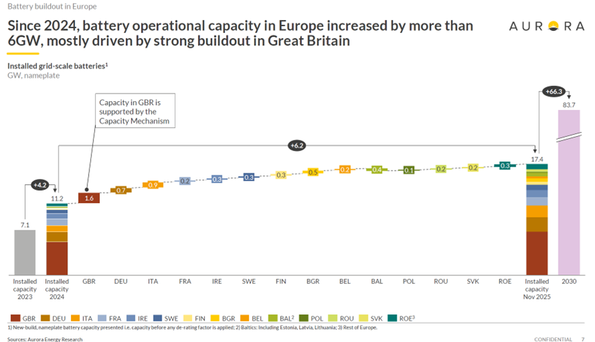 2025年,欧洲新增电网级电池储能装机约6.2GW,这一数字较2024年的4.2GW增长了近50%,再次刷新历史纪录。截至2025年11月,欧洲累计运营的电网级储能容量已达17.4GW。与之对比,2023年底欧洲的储能装机还只有7.1GW左右,短短两年间几乎翻了1.5倍。