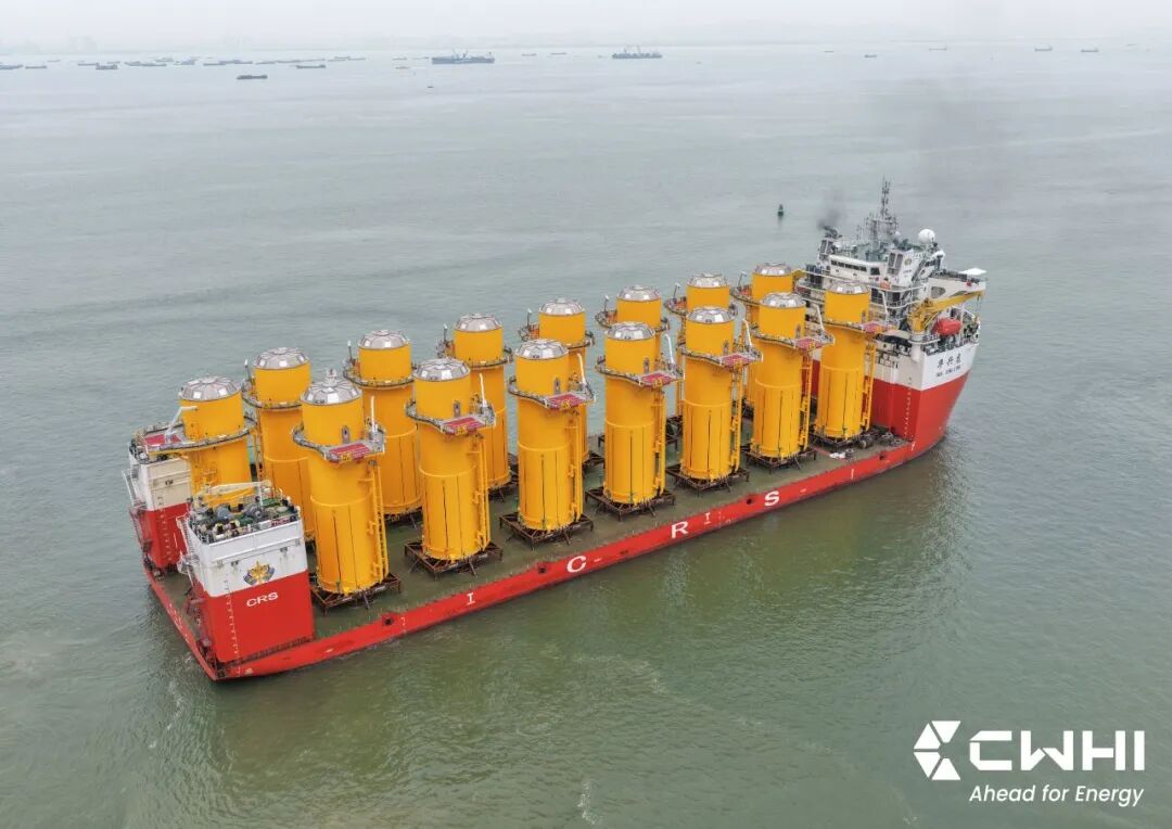 首批15套过渡段于2025年11月由“华盛龙”号重型起重船运出,并于今年1月抵达苏格兰。本次第二批15套过渡段已装船启航,由中远海运“华兴龙”轮运往苏格兰利斯港。所有单桩基础已与去年年底交付完毕。