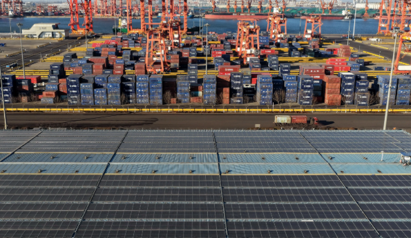 2025年12月25日拍摄的唐山市海港经济开发区一家企业厂房屋顶上的光伏发电板(新华社)