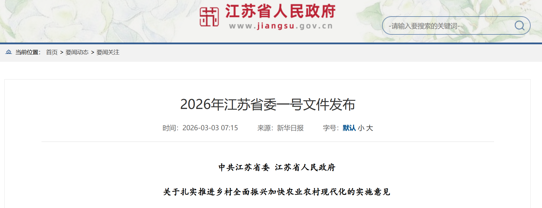 日前,中共江苏省委、江苏省人民政府发布《关于扎实推进乡村全面振兴加快农业农村现代化的实施意见》。