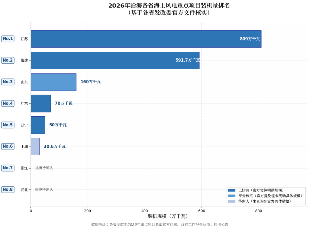 据各省发改委公布的重点项目名单,江苏、福建、山东、广东、辽宁五省海上风电重点项目已核实规模达1680万千瓦。