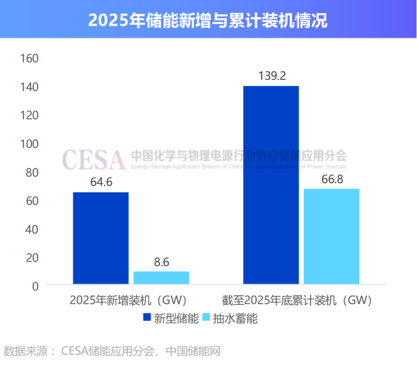 据CESA储能应用分会产业数据库统计,2025全年,中国新型储能新增装机64.6GW/196.5GWh,同比增长52%(功率)/79.3%(容量);抽水蓄能新增装机8.6GW。截至2025年底,中国新型储能累计装机139.2GW/373GWh,较2024年底增长了86.5%(功率)/111.4%(容量),抽水蓄能累计装机66.8GW。