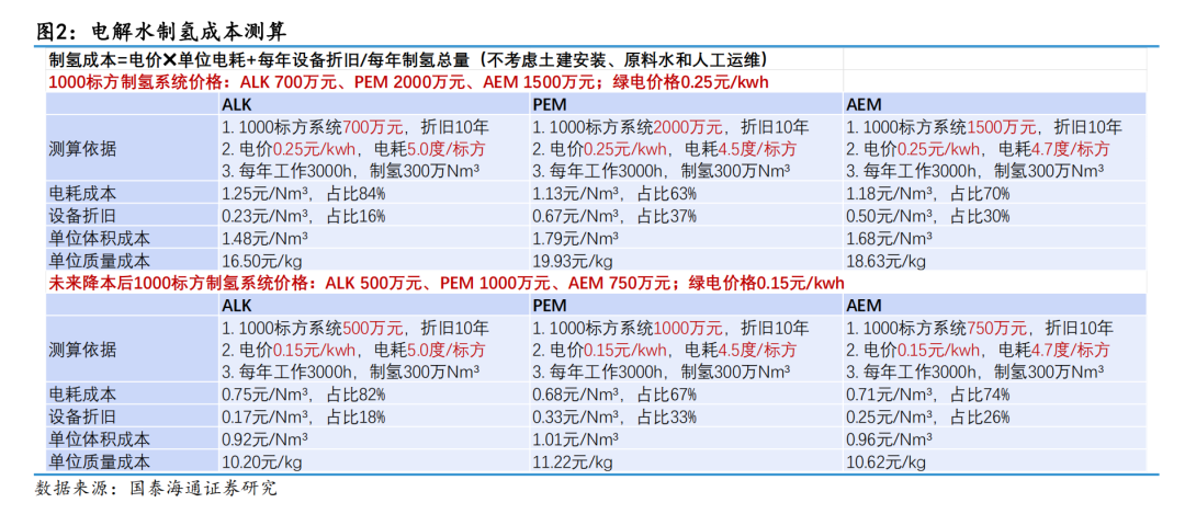 未来电解水制氢路线谁将胜出,制氢成本是核心因素。在大型制氢基地的成本模型中,土建安装、原料水和人工运维占比大约10%,这部分是相对固定的成本。制氢成本更多的是由电耗成本、设备折旧两方面决定,其中电耗成本大约占总成本的70%,电解槽折旧占比约20%。由此可见,未来光伏和风电电价的降低对制氢成本影响更大。