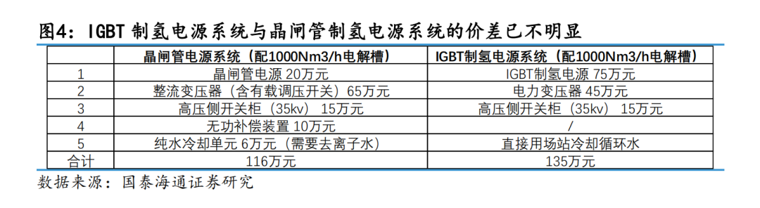 2024年2月,我们曾发布过研究报告《制氢电源:晶闸管 or IGBT》,预测了在未来离网制氢趋势下,IGBT将凭借与风光波动性更佳的匹配效果,逐步替代晶闸管。同时,具备大功率风电变流器制造经验的玩家将成为制氢电源赛道的佼佼者。