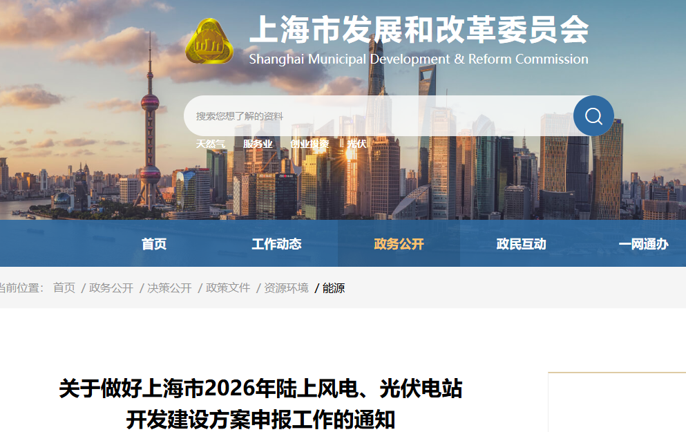 3月10日,上海市发改委印发《关于做好上海市2026年陆上风电、光伏电站开发建设方案申报工作的通知》。