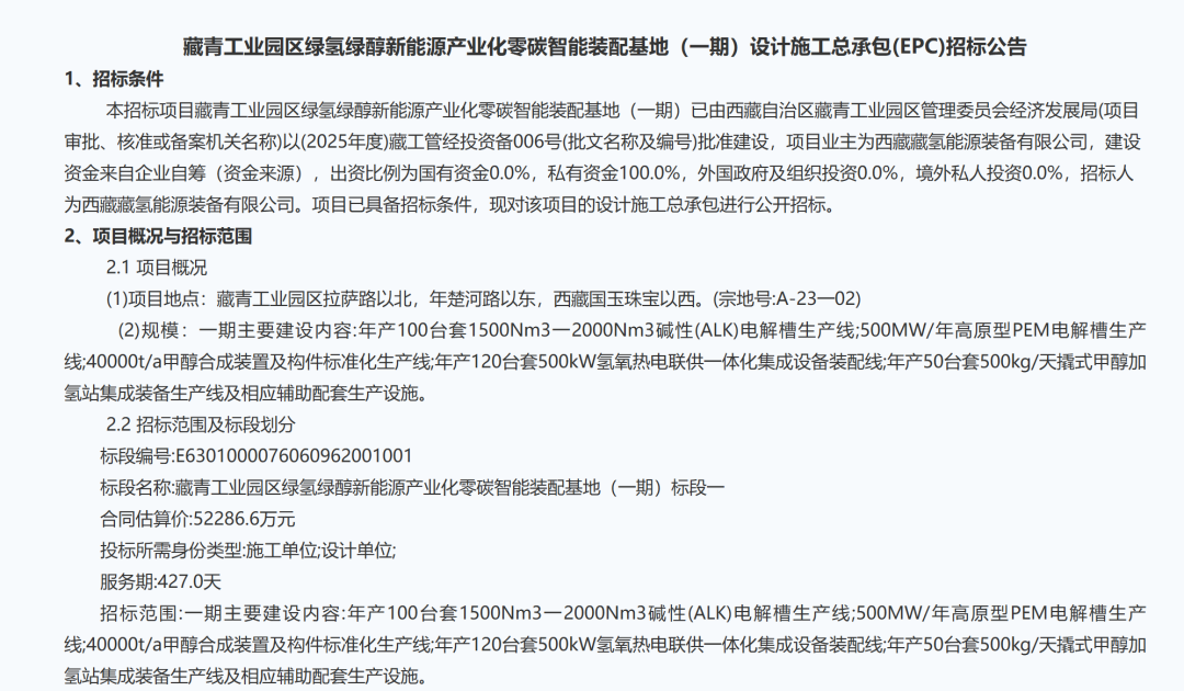 碳索氢能网获悉,3月7日,藏青工业园区绿氢绿醇新能源产业化零碳智能装配基地(一期)设计施工总承包(EPC)招标。