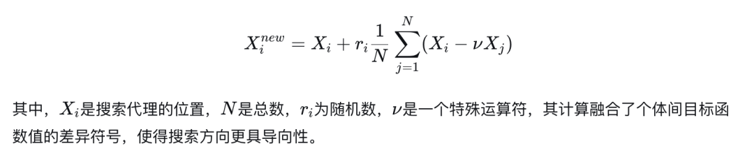 SABO算法的核心思想颇具哲理:它不盲目追随当前的最优个体,而是计算整个种群所有个体位置的平均差异来指导搜索方向,强调“集体智慧”。其位置更新公式为: