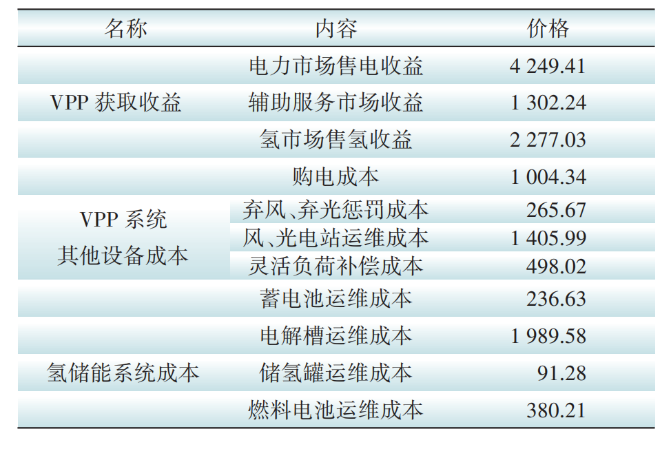 在成本端,下层VPP系统的总运行成本为5871.51元。成本构成非常细化,包括:从电网的购电成本1004.34元,风光电站的运维成本1405.99元,因预测偏差导致的弃风弃光惩罚成本265.67元,对用户进行负荷调节的补偿成本498.02元,以及蓄电池、燃气轮机、甲烷发生器的运维成本。氢储能系统自身的运维成本也被单独列出,其中电解槽成本最高,为1989.58元,这主要源于其在低电价时段的大量运行;储氢罐和燃料电池的成本则相对较低。